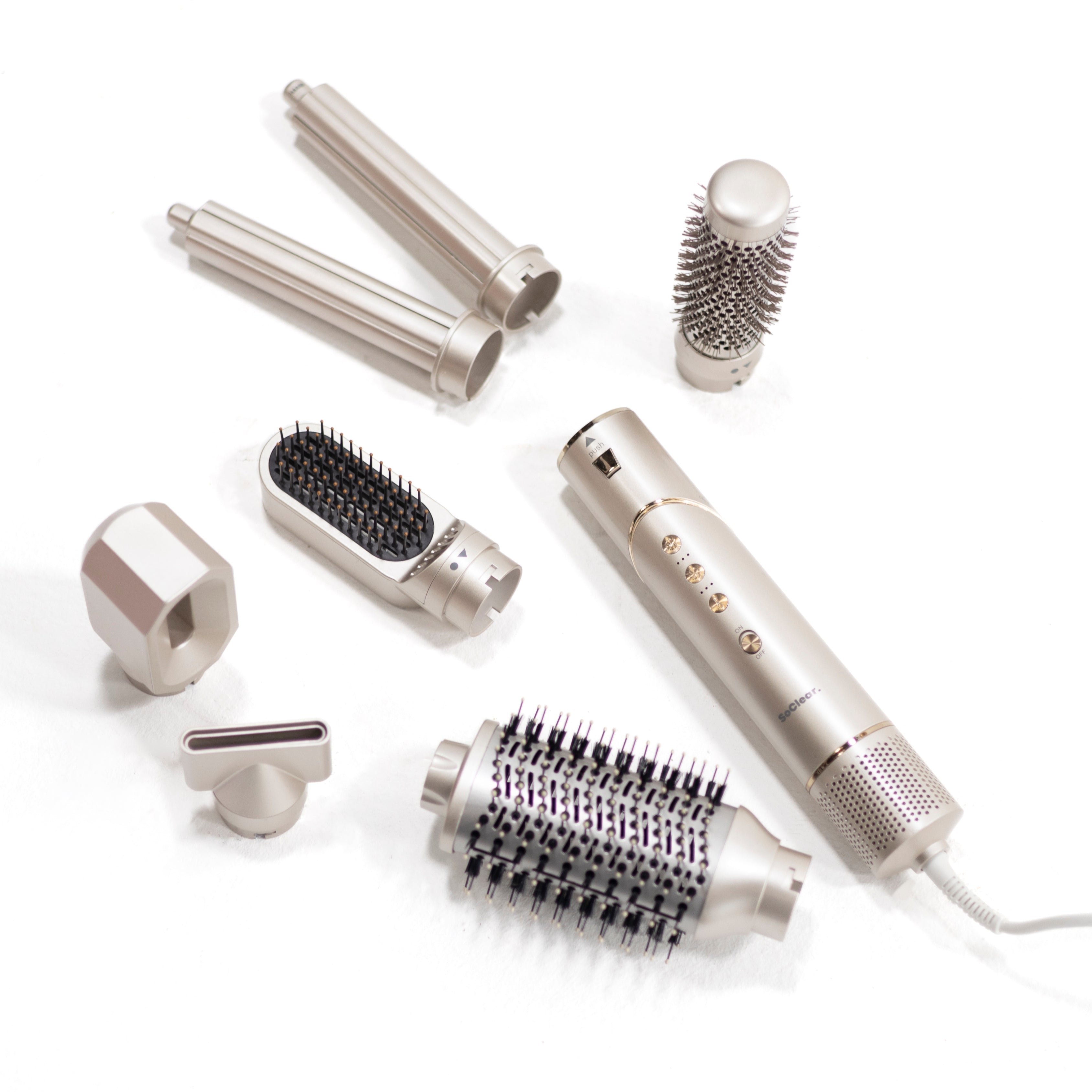 7 udskiftelige hoveder (luftkoncentrator, glattebørste, bølgebørste, smooth dryer, volumebørste og 2 krølletønder) + selve styleren med 3 varme- og hastighedsindstillinger.